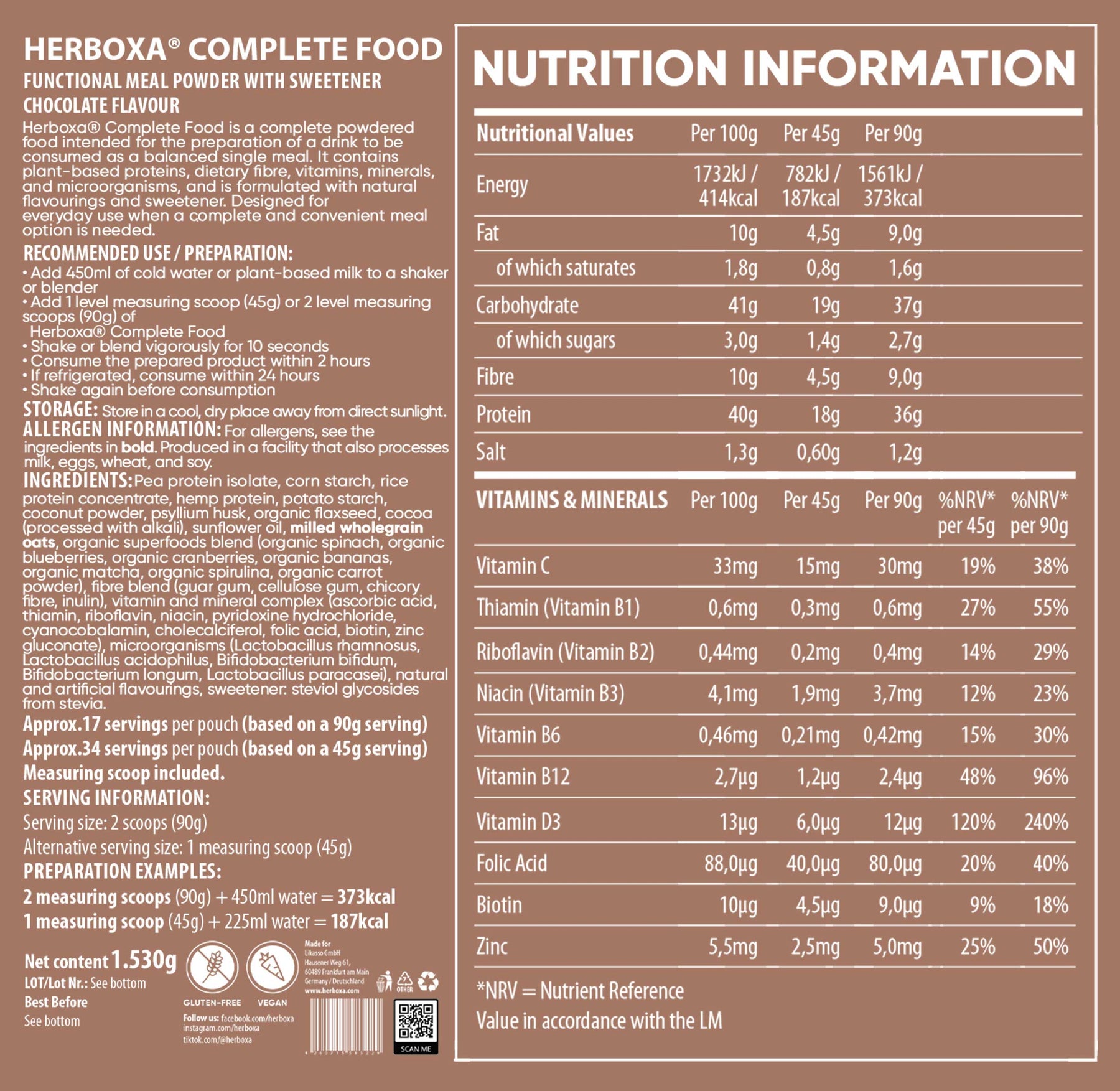 Každá 90 g porcia Herboxa Complete Food poskytuje 36 g kvalitných rastlinných bielkovín, ktoré sú získané z hrachu a ryže na poskytnutie sýteho a dobre vyváženého profilu bielkovín.