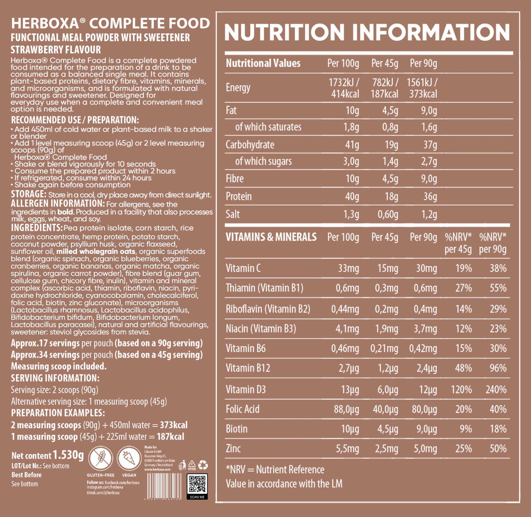 Každá odmerka Herboxa Complete Food je vytvorená s obsahom esenciálnych živín, vitamínov a minerálov, ktoré presahujú štandardnú výživu a efektívne zapadajú do každodenného života.